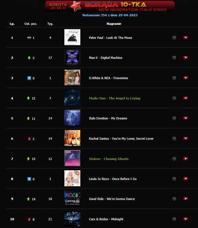 29 апреля на польском радио RM-80 вышел очередной еженедельный хит-парад исполнителей Italo Disco New Generation. По итогам этой недели ТРИ песни российских проектов вошли в "Горячую десятку" NEW Italo Disco. Основная ДЕСЯТКА Как и неделю назад, Peter Paul снова на первой строчке. Песня "Look At The Moon" лучшая на этой неделе!!! Песня "Digital Machine" в исполнении Max-X на этот раз на ВТОРОМ месте!!! Поляки поддержали своими голосами проект из своей страны и на этот раз песня поднялась еще выше. Новинка этой недели - российско-германский дуэт D.White & NEA с песней "Frenemies" из пропозиции, благодаря голосам слушателей, попали в "Горячую десятку" и заняли почетное ТРЕТЬЕ место!!! На ЧЕТВЕРТОЕ место поднялся Mode One с песней "The Angel Is Crying". Обратите внимание на эту песню!!! В лучших традициях Итало-Диско!!! Замыкает пятерку лучших песен недели - Italo Emotion "My Dreams". Испанская певица Rachel Santos и ее песня "You're My Lover, Secret Lover" на этот раз только на ШЕСТОМ ме