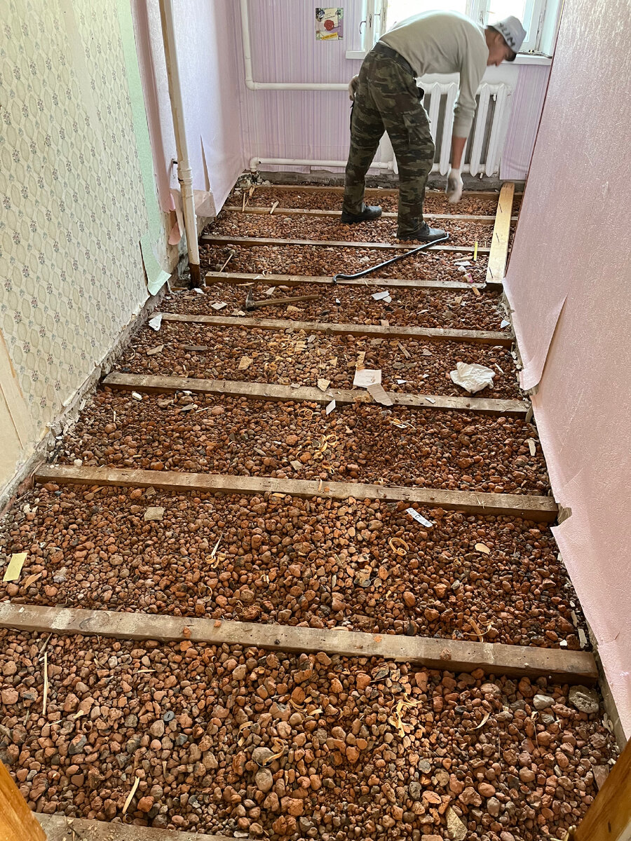 Сегодня начали ремонт. Слава Богу. Долгожданный день настал. Как я уже писала, начали с демонтажа. Бригада из четырёх человек - узбеки. Оказались пунктуальными. Ровно в 7-00 приехали ко мне. Повторили план работы. Разбить на доски всю мебель, вынести в гараж, сложить. Поднять деревянные полы и лаги, вынести в гараж. Сломать некоторые межкомнатные стены. Срезать чугунные батареи и трубы отопления. За всю эту работу договорились на 30 тыс. рублей. Подняли полы. Под полом оказался керамзит. Об этом мы раньше не говорили. В оговоренную цену он не входил. Затарить в мешки и вынести в гараж назначили цену в 20 тысяч. Весь керамзит, на двух этажах и чердаке, сложить в мешки и вынести в гараж. По объёму примерно Камаз. Итого 50 тысяч рублей. К концу первого дня демонтажа были вскрыты и освобождены полы на втором этаже. Чердак полностью очистили от досок, керамзита и мусора. Осталось вынести бак для воды с чердака. Раньше, после постройки дома, из этого бака подавалась вода. А последнее вр