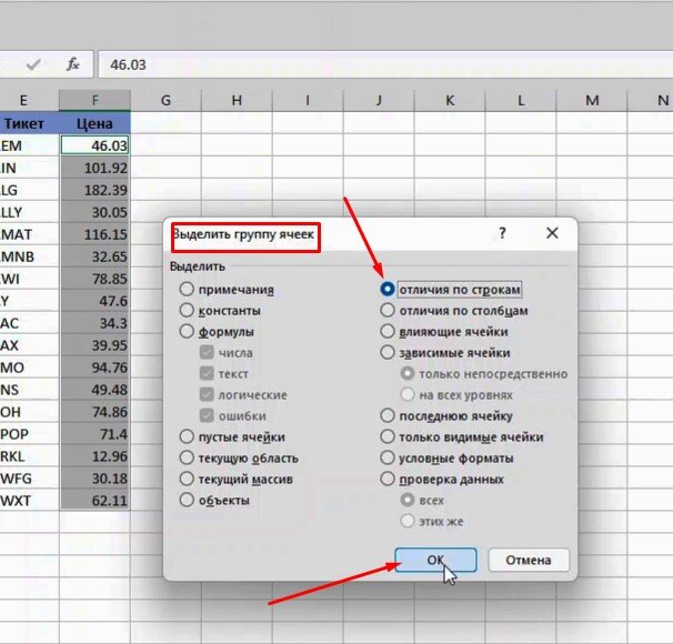 📌 В новом окне выбираем функцию "отличия по строкам" и подтверждаем "ОК".