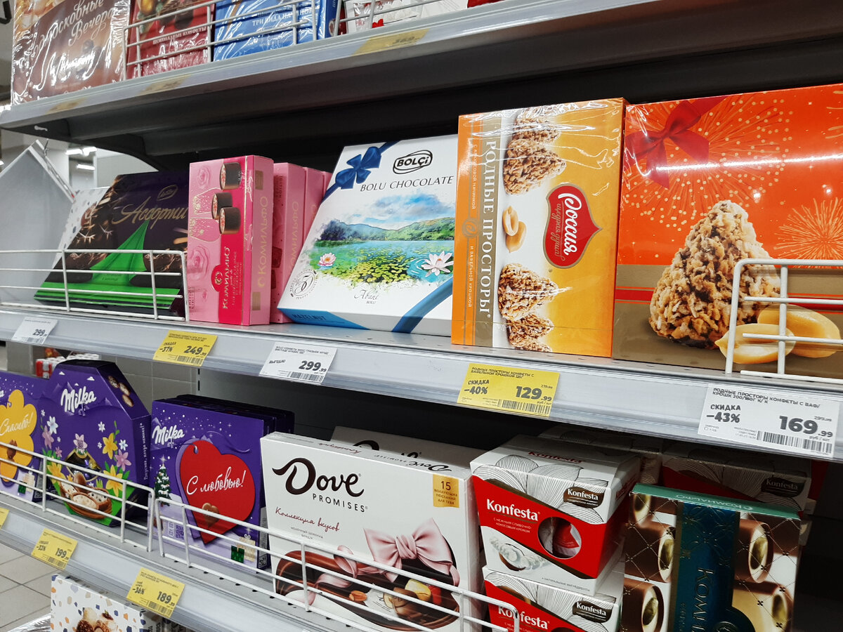 Например, от Красного октября ассорти в пакетах с известными названиями (Красная шапочка, Алёнка, Мишки) идёт по акции -46% от цены.