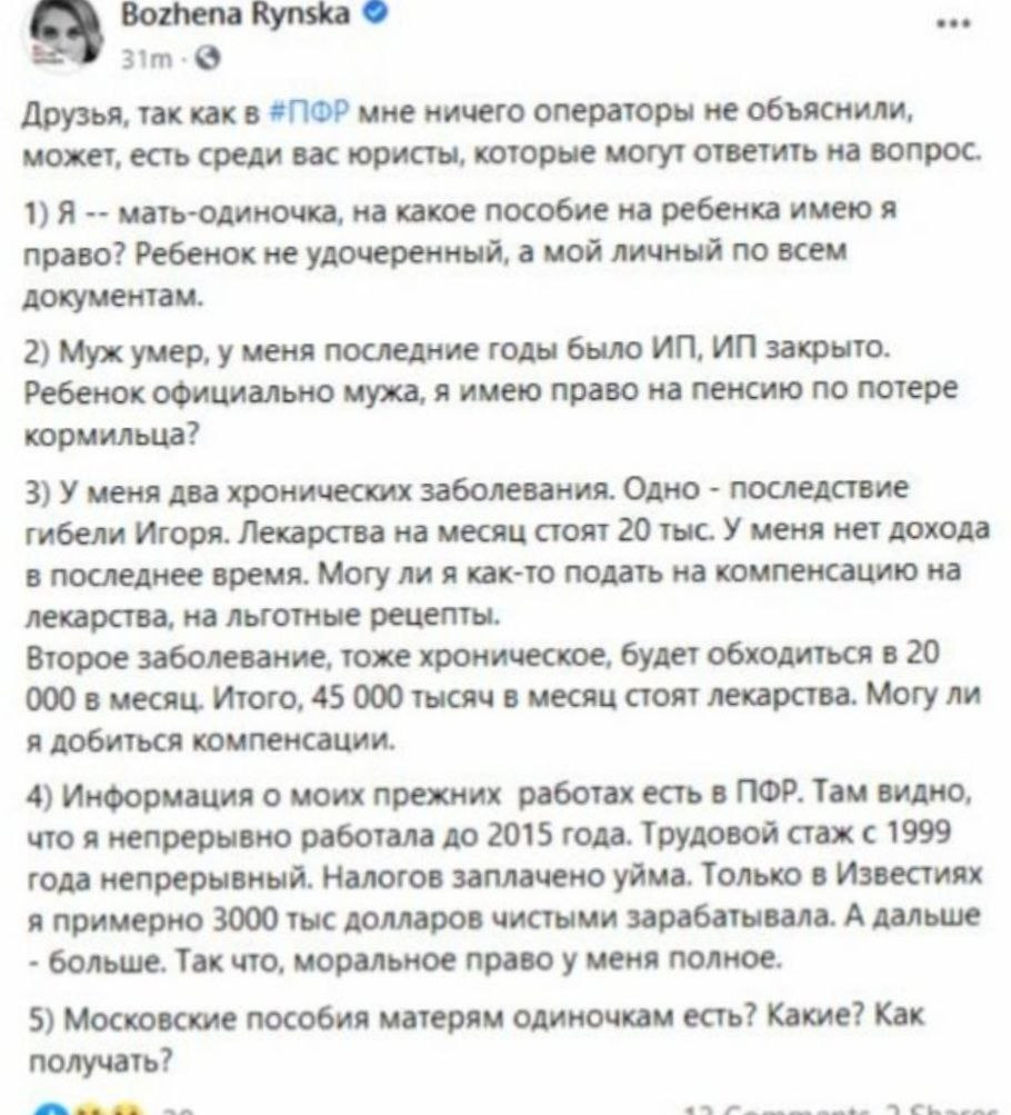 Я не пойму, если Божена зарабатывала в "Известиях" примерно 3 000 "чистыми" (что за терминология, право!), почему она все время что-то просит у людей? Где деньги, Зин? И про хронические заболевания интересно. Что там с ней произошло? Ну, с первым, которое из-за Игоря, в целом все понятно - ее без наследства оставили, там, конечно, заболеешь, кто бы спорил? А второе хроническое - это что? Что там такое с ней произошло? Божена - она вообще прикольная. Какая ей пенсия по потере кормильца? Ежемесячное пособие - и привет. И то вон в Израиле пусть оформляет. Она не инвалид и ей нет 55 лет. И не нетрудоспособная вроде, насколько я знаю. Обойдется без пенсии, я уверена в этом. При зарплате 3 000 долларов "чистыми" 9 000 рублей вообще некомильфо просить. А ребенок имеет право, да. Вот ребенок пусть и получает - если, кончено, муж Божены записан его отцом. Там были какие-то споры по этому поводу, я помню. А вообще, забавно смотреть, как Боженка пытается выцарапать у государства копейки (ну дава