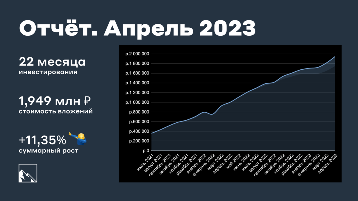 Суммарно: 1 815 569 + 100 000 (пополнение) + 34 249 (рост) = 1 949 818 ₽