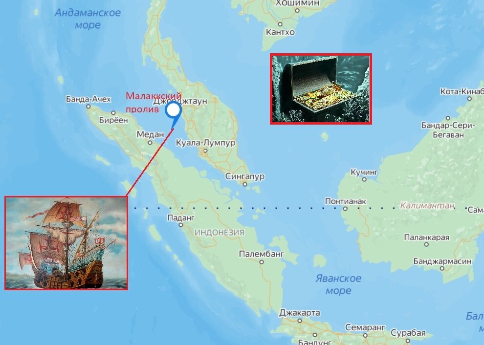 Португальский корабль Flor de la Mar считается самым дорогим, в переводе на денежный эквивалент, из когда-либо затонувших судов в море. На его борту только по предварительным данным, находятся не менее двухсот сундуков, с драгоценностями. Это было лучшее судно своего времени. Исследователям даже примерно известно, где корабль затонул. Но он по-прежнему не обнаружен. Точно известно, что Flor de la Mar затонул в Малаккском проливе Мировые кладоискатели заявляют, что определили площадь для поисков и им даже изветсно точное место. Корабль затонул в 1511 году. По заявлениям очевидцев и спасенных членов экипажа, произошло это у берегов острова Суматра. Сложность поисков заключается в том, что это один из самых оживленных морских путей в мире. На дне пролива покоится порядка 500 кораблей, и один из них Flor de la Mar. Максимальная глубина пролива всего 113 метров, а средняя в 2 раза меньше. Искать клад на такой глубине вполне осуществимая задача. Но протяженность пролива более существенна, э