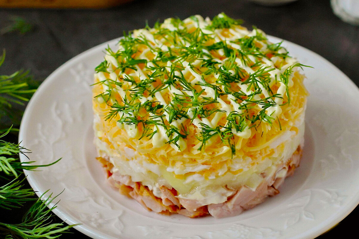 Ингредиенты: · 250 г куриного филе (или другого мяса) · 1 луковица · 2 чайные ложки сахара · 1 столовая ложка уксуса 9% · 4 яйца · 2 средних картофелины · 2 плавленых сырка · майонез · соль Лук мелко нарезать. Добавить сахар и уксус. Далее, залить кипятком и перемешать. Курицу, яйца, картофель отварить до готовности, остудить. Нарезать курицу небольшими кусочками. Яйца натереть на крупной тёрке (желтки и белки отдельно). Картошку и охлаждённый сыр — на мелкой тёрке. Далее, выложить салат слоями: курица, лук (жидкость слить), картофель, желтки, сыр и белки. Каждый слой промазываем майонезом. Не забудьте также посолить. Дайте пару часов пропитаться и готово! Приятного аппетита!
