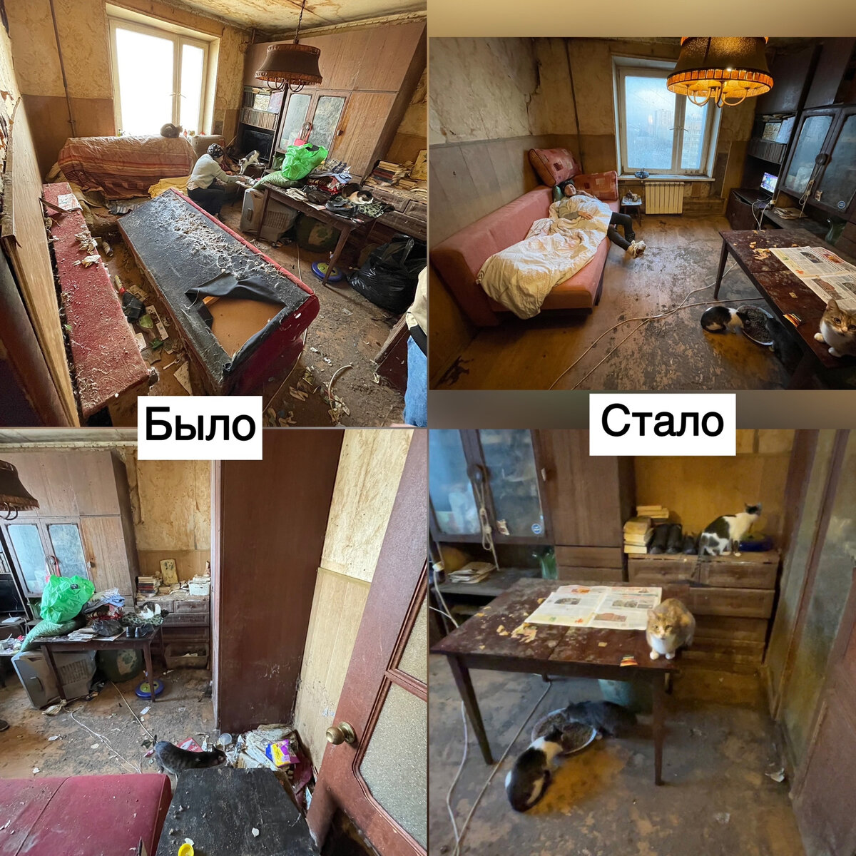 Убирали и выгребали мусор огромными пакетами, чистили и скребли лотки, наводили красоту в ванной и туалете. Даже нашли сантехника-электрика, который согласился взяться за работу в таких условиях.