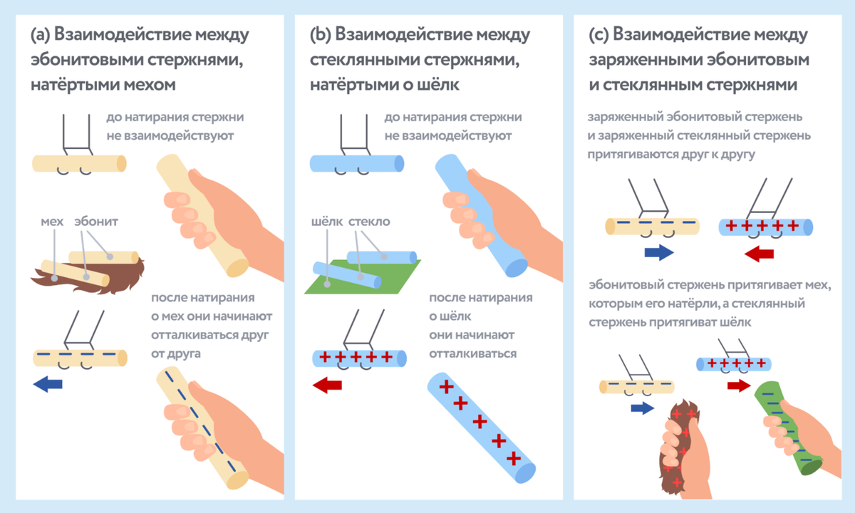 Почему? А потому, что умозрительных электростатических видов "плюс+" и "-минус" зарядов нет! В природе не существует! Их выдумали и высосали из пальца! Поэтому и прибора нет непосредственного измерения(определения) вида заряда. Чтобы определить знак заряда, нужно проверить будет ли он притягиваться или отталкиваться от другого заряда, знак которого известен. а как определить знак заряда "известный"--а никак! только обозвать! Придумал эти виды некий француз Charles François de Cisternay du Fay в 1729 г. как два рода: «стеклянный» и «смоляной» (сейчас их называют положительным и отрицательным);Один образуется при трении стекла о шёлк, а другой — смолы о шерсть. А раз стекло притягивается к смоле-то стекло плюс, смола минус....а какой больше-меньше, роли вообще не играет! Для первого эксперимента нам понадобятся эбонитовые, пластиковые или янтарные стержни, а также мех, натуральный или искусственный. Потрём стержни о мех, чтобы зарядить их, как на рис. 1a. Теперь стержни отталкиваются