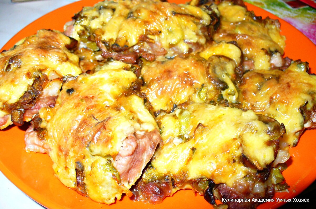 Свинина запеченная с грибами и маринованными огурчиками