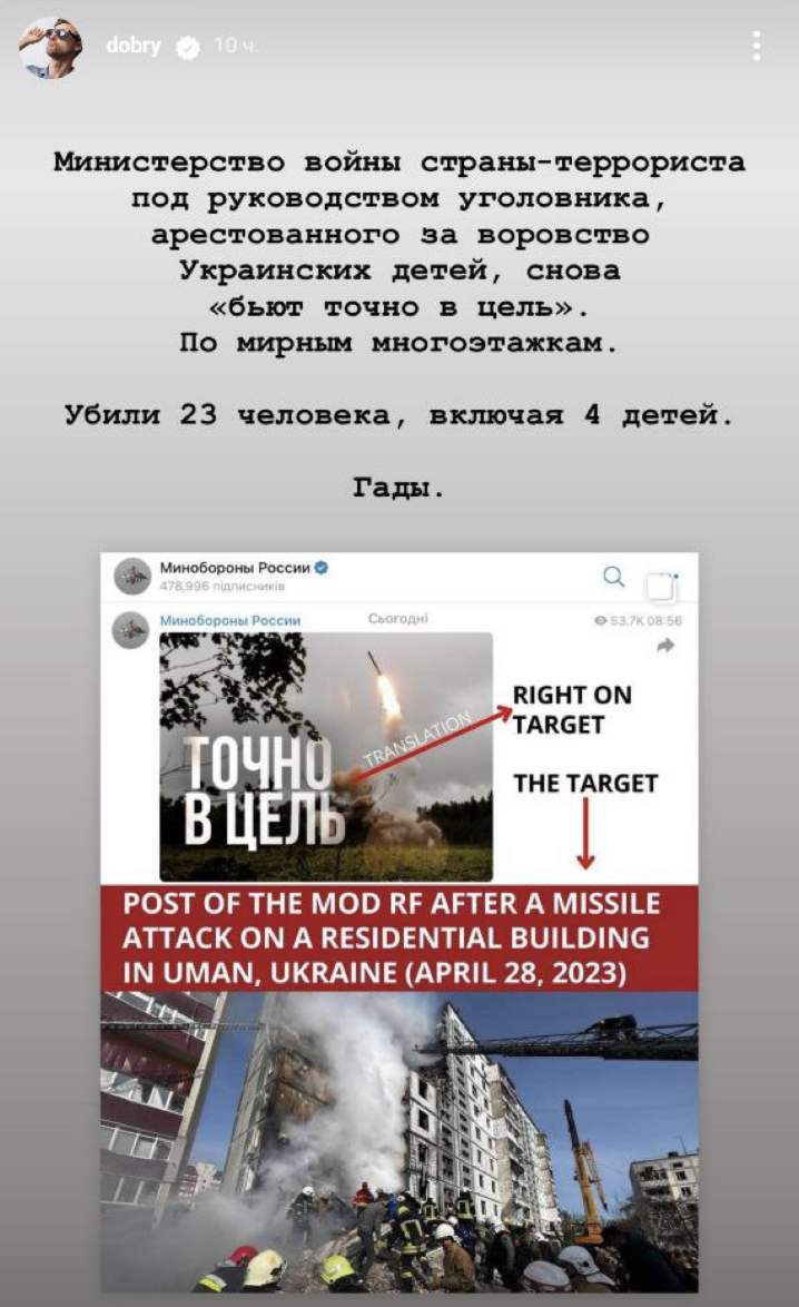 Как-то листая запрещенную в России социальную сеть с картинками и фильтрами, наткнулся на историю Андрея Дороничева, который мне очень нравится своими мыслями, историей своей жизни, какой-то харизмой, заставившей на него подписаться и читать до сих пор. Узнал я про него, думаю как и большинство, после фильма Дудя "Кремниевая долина". Классный фильм для тех, кому интересен мир IT, программирования, фанатам одноименного сериала тоже понравится. Если коротко, Андрей Дороничев — это стартапер и программист родом из России, который в свое время, бросив все, переехал сначала в Европу, а оттуда в США. Андрей является создателем мобильного приложения Youtube, которым мы все пользуемся, сейчас инвестирует в мелкие и крупные стартапы, скажем так, типичная история из Калифорнии. Вернемся к истории, которая попалась мне на глаза: Он ее выложил после того, как одна из сбитых российских ракет попала в жилой дом города Умань. Для начала про его слова о "стране-террористе" и так далее. Я буду коррек