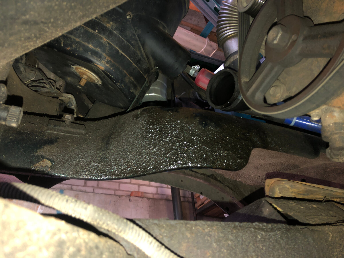 Стал замечать подтеки в районе лонжерона. Подумал, что это возможно солярка с ФТОТ. Подтеки и на патрубке с турбины, а также масляная "шуба" навели на мысль, что возможно прохудился патрубок от интеркулера (ТРУБА ПОДВОДЯЩАЯ ТУРБОКОМПРЕССОРА 3163-80-1173120-10 /КОД 3163-80-1173120-10). До этого, недавно рвался шланг слива масла с турбины, заменил вместе с хомутами, пружинный ослаб и почти не зажимал шланг. . Благо мой сосед по гаражам, аргонщик, был на месте и подварил. Установил на место, по возможности изолировав от соприкосновения с кузовом. Теперь буду думать, на что его заменить, т.к. это постоянный источник вибраций. С патрубку с завода был приварен кронштейн, но он давно отвалился от тряски. Как вариант пока видеться комбинация трубы с более толстыми стенками и силиконовых патрубков. Еще есть подтеки масла в районе нижнего натяжителя. Раньше было подозрение на трубу промвала, замазал стык поксиполом, труба вроде теперь чистая. Поддон переклеивал. Есть подозрение на масло