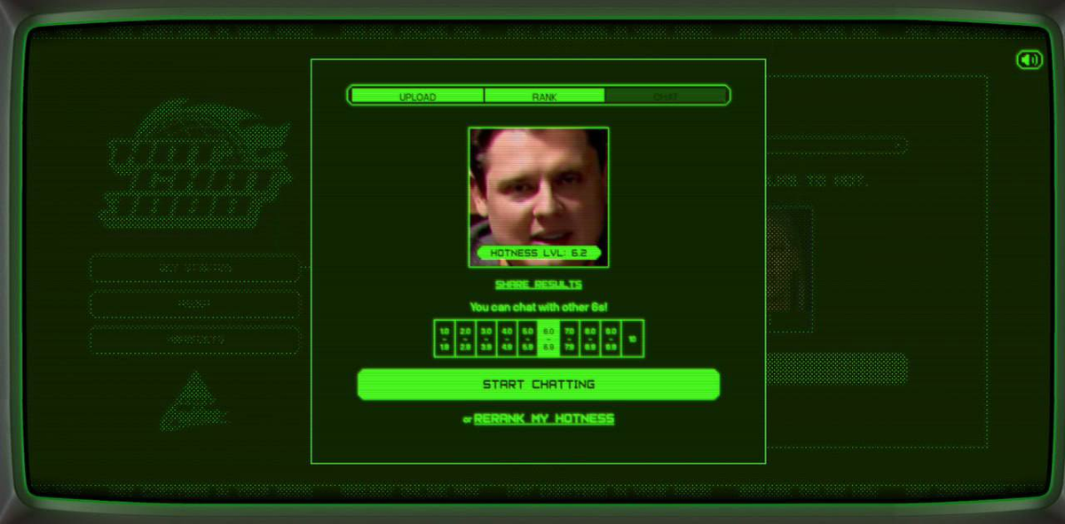 В чем суть: загружаете фотографию, сервис оценивает, насколько вы «горячи» от 1 до 10 и подбирает собеседника соответствующего уровня привлекательности.