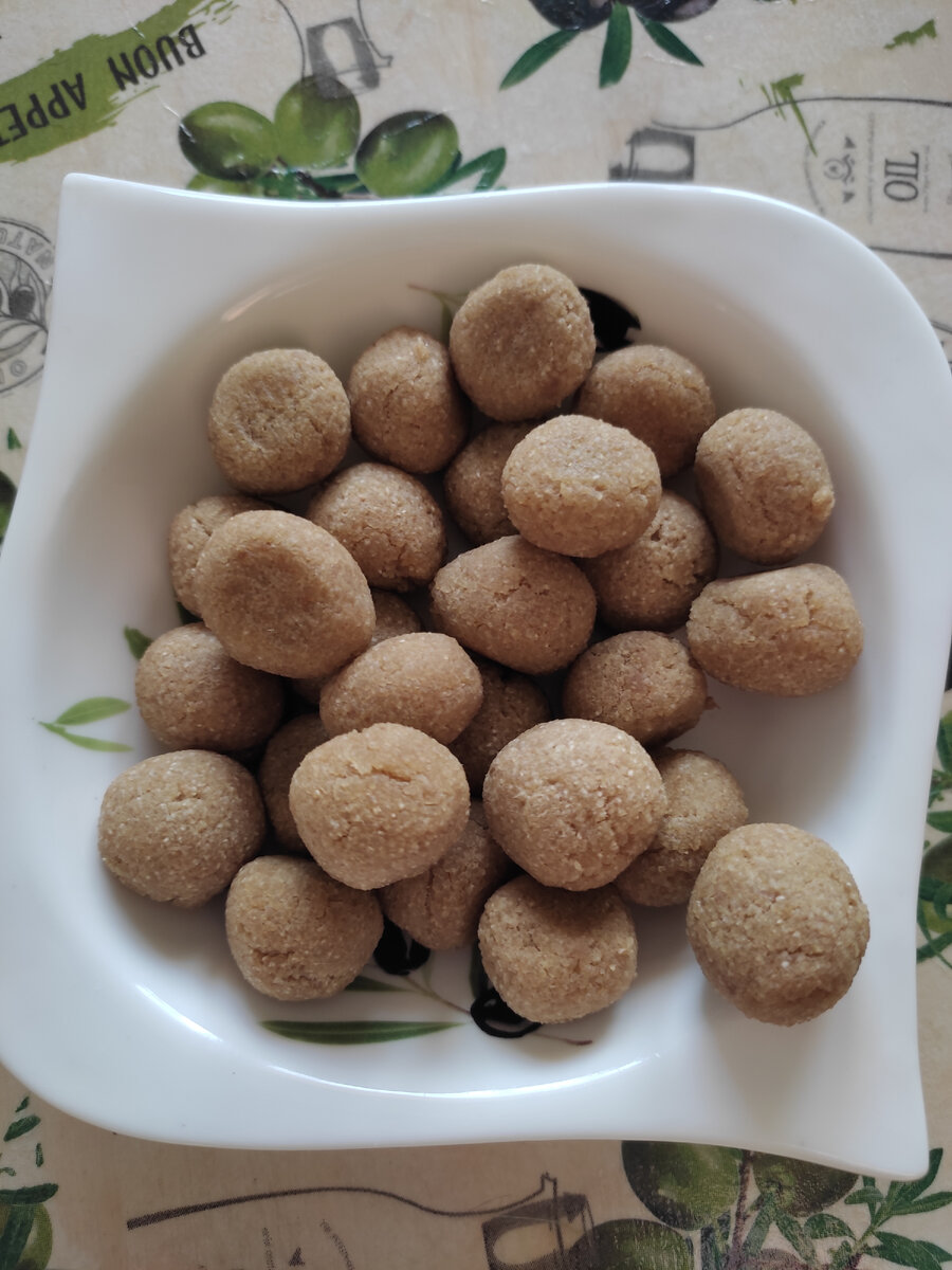 Этот рецепт был честно подсмотрен на одном из "собачьих" каналов в социальной сети. Хозяйка канала использовала это печенье для дрессировки подрастающего поколения и называла его "Попкорном для щенков". Рецепт совсем простенький, поэтому был взят на вооружение. Плюсы: 1. Минимальное количество доступных ингредиентов. 2. Готовится очень быстро. 3. Хранится без холодильника. 4. Не пачкает, можно сделать совсем небольшие порции и брать с собой на улицу. 5. Мясное, но с минимумом жиров. Минусы: 1. Калорийное. Итак, нам понадобится всего лишь баночка мясного детского питания - 100 граммов и половина стакана манки. Манки в доме не водится, пришлось купить специально. Манка какая-то странная - очень желтая. Но, думаю, на конечный результат это не очень повлияло. Банка питания, 1/2 стакана манки, все тщательно перемешиваем, даем постоять минут пять, чтобы манка набухла. Формируем мелкие шарики, и в духовку при температуре 150 градусов на 15 минут. Пока этот "щенячий попкорн" поджаривается в д