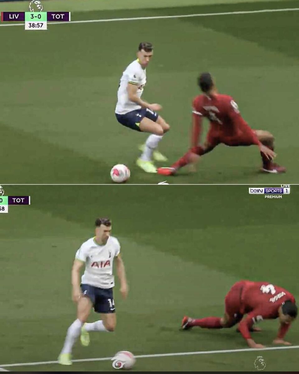 Собрали лучшие. «Ливерпуль» и «Тоттенхэм» устроили шоу на «Энфилде» и выдали яркие 4:3. Но еще до камбэка, который, впрочем, провалился из-за гола Диого Жоты, лондонцы подарили один из главных эпизодов дня. Команда Клоппа вела 3:0, но в конце первого тайма Иван Перишич эпично уронил Ван Дейка: на 39-й минуте он убрал Вирджила на замахе и отдал в центр, где Харри Кейн в касание прошил Алиссона. Только посмотрите, как непроходимый голландец плюхнулся на газон! Вирджил сыграл в стиле Дайо Упамекано или Харри Магуайра. Или Джерома Боатенга. Непривычно! Помните, как Ван Дейка не могли обыграть больше года? Если точнее, с марта 2018-го по август 2019-го Вирджил вообще никого не пропускал, выдержав серию из 65 игр. Это достижение чуть не принесло ему «Золотой мяч». После этого Ван Дейк получил серьезную травму – обойти его все еще сложно, но хотя бы возможно. И Перишич сделал это так издевательски, что интернет заполонили мемы. Учитель: «Кто-нибудь может показать нам, как танцевать лимбо?» Ва