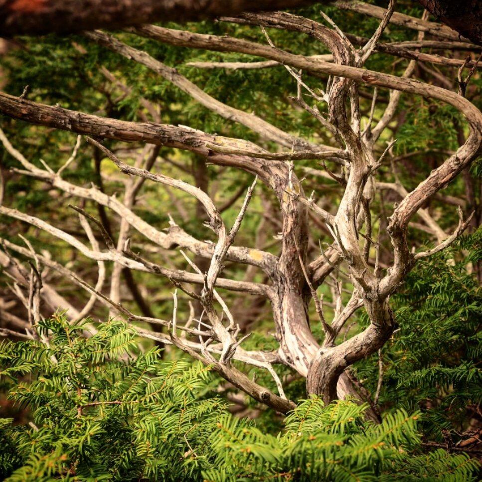 Тис имеет очень тёмный цвет хвои и насыщенно бронзовый цвет коры, похожей на чешую сказочного древнего змея. А при плотном произрастании, как на этом острове, образуется интересный эффект - сомкнутые вечнозелёные кроны не пропускают солнечный свет и не дают вырасти в тени подростам практически никаких других деревьев. Плотная естественная монопосадка тиса не практически пускает внутрь ветер.