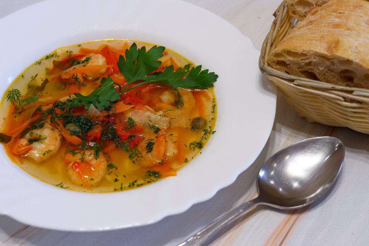 Это очень лёгкий и питательный суп. Подойдёт тем, кто придерживается правильного питания, но не отказывает себе в удовольствиях. Вода – 2,5 л Креветки очищенные – 300 г Перец сладкий – 1 шт. Корень сельдерея – ¼ Морковь – 1 шт. Лук репчатый – 1 шт. Свежая зелень (петрушка, лук) – 10 г Лимонная цедра – 1 чайная ложка Корень имбиря (измельчённый) – ½ чайной ложки Чеснок – 2-4 зубчика Масло оливковое – ½ столовой ложки Перец чёрный молотый, кориандр, семена фенхеля, соль – по вкусу Приготовление: 1. Вскипятить воду. 2. Нашинковать сельдерей, морковь, сладкий перец соломкой. Опустить в кипящую воду. Варить примерно 5 минут на среднем огне. 3. Нашинковать лук полукольцами. 4. Нагреть сковороду, прогреть специи: острый перец, кориандр, фенхель. 5. Добавить к специям измельчённые имбирь, чеснок, цедру лимона. Перемешать. 6. Добавить в сковороду лимонный сок, оливковое масло и обжарить слегка креветки с луком. 7. Добавить в овощной бульон обжаренные креветки с луком. Посолить, довести до кипен