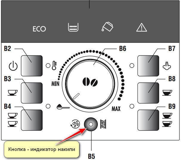 3. Нажимаем и в течении 5 секунд удерживаем кнопку индикатора очистки накипи.