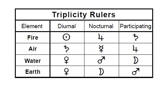Сразу отмечу, что Золлер в своей практике использует птолемеевскую цельнознаковую систему домов и квадрантную Алькабитуса, однако не возражает и против системы Плацидуса. Для определения силы планет: термы — египетские, по три балла силы получают все три управителя триплицитета независимо от дневного/ночного времени рождения.