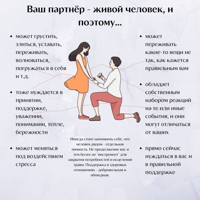 2. Принятие партнёра. Понятное дело, что в начале отношений мы можем идеализировать своего партнёра, но постепенно начинаем замечать и недостатки. Умение принимать личность в разных гранях - важный навык. Мы не можем изменить человека. Мы можем сделать выбор