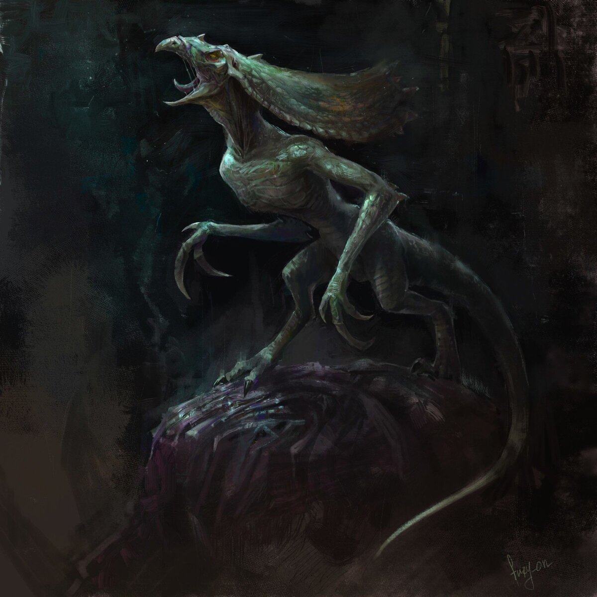 Более всего тварь напоминала тощего, гуманоидного трицератопса. Покрытое бледной, какой-то грязной, мелкой чешуёй тело, не сильно отличающееся от человеческого, венчала голова с большим шипастым костяным «воротником», длиной сантиметров семьдесят и шириной около полуметра. Вместо рта у существа был здоровенный клюв, которым оно, в данный момент, рвало мясо и по-птичьи глотало.