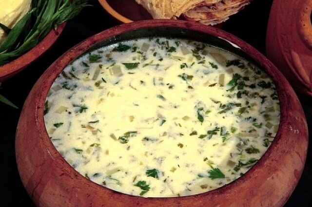 Количество калорий 467,7 ккал Белки 10,8 г Жиры 30,8 г Углеводы 36,4 г ИНГРЕДИЕНТЫ • 500 г мацуна (мацони) • 3–4 ст. л. жирной сметаны • 1/2 стакана пшеничной крупы дзавар • 1 яйцо • 3 ст. л. муки и соль по вкусу • 1 маленький пучок кинзы • 1 маленький пучок мяты • 2 средние луковицы РЕЦЕПТ ПРИГОТОВЛЕНИЯ Шаг 1 Пшеничную крупу промойте в холодной воде, откиньте на сито. Положите дзавар в кастрюлю, залейте большим количеством холодной воды, доведите до кипения, варите до мягкости, 20–25 мин. Откиньте на сито, дайте стечь жидкости. Шаг 2 Взбейте яйцо с просеянной мукой и солью. Мацони взбейте со сметаной в кастрюле с толстым дном, добавьте яичную смесь и взбейте до однородности. Добавьте крупу и перемешайте. Шаг 3 Разведите получившуюся массу 2–2,5 стаканами холодной воды (количество воды зависит от густоты мацони), вливая ее постепенно. В результате масса в кастрюле не должна быть ни густой, ни слишком жидкой. Шаг 4 Поставьте кастрюлю на небольшой огонь (если плита газов