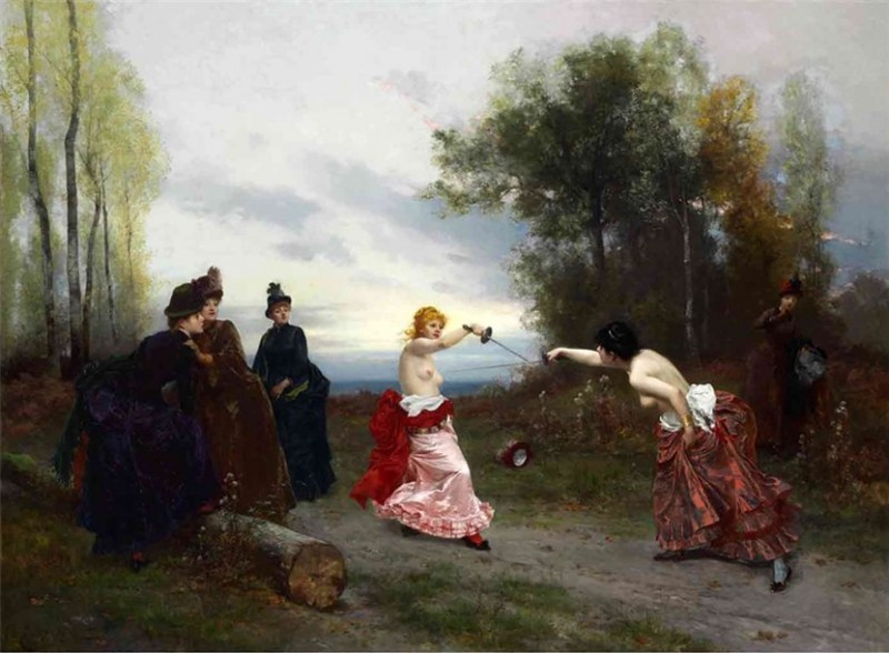 Повторю иллюстрацию, которой открывалось письмо № 7 данной серии, поскольку «по кругу» изложение вернулось к тому, с чего начинали. Очень характерный спор стал причиной дуэли между графиней Кильмансегг и принцессой Паулиной Меттерних в 1892 году в Лихтенштейне. Барышни не смогли договориться по жизненно важному вопросу: как следует украсить зал для музыкального вечера? То есть по вопросу, касающемуся эстетики. Соперницы сражались топлесс — чтобы их раны оставались чистыми