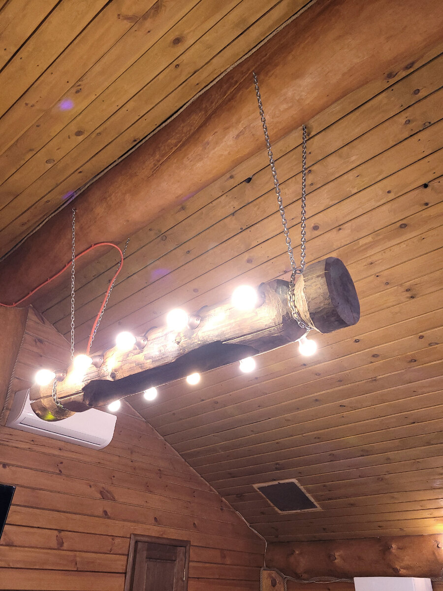 Проведите внутри бревна электрический провод. Прикрутите с двух сторон патроны. Подвесьте люстру и вкрутите лампочки. Все, крутой светильник в стиле
