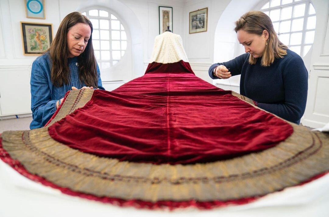 Всего пять дней осталось до коронации, и Букингемский дворец подогревает интерес к ней, подкидывая новые подробности. По традиции, король с королевой прибудут на коронацию в алых парламентских, а покинут Вестминстерское аббатство в пурпурных имперских мантиях длиной около пяти метров. Обычно все они шьются для каждого монарха индивидуально. Но, как мы уже поняли по опустевшим витринам музея Тауэра, Карл решил воспользоваться коронационными атрибутами своих предков - во имя экономии и экологии. Поэтому портные из основанного в 1689 году старейшего лондонского ателье Ede and Ravenscroft и Королевской школы вышивки подновили подкладку и золотое шитье и восстановили блеск бархатных мантий, отороченных мехом канадского горностая, которые надевали Георг VI в 1937 году и Елизавета II в 1953. Единственной новой мантией будет та, в которой уедет с коронации королева Камилла. Она была сшита в Королевской школе вышивки (патроном которой супруга Карла III является с 2017 года) из пурпурного барх