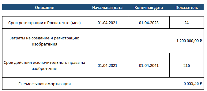 Затраты на создание и регистрацию изобретения, по данным бухгалтерского учета составили 1,2 млн. руб. и отражены в составе нематериальных активов апрелем 2023 года.