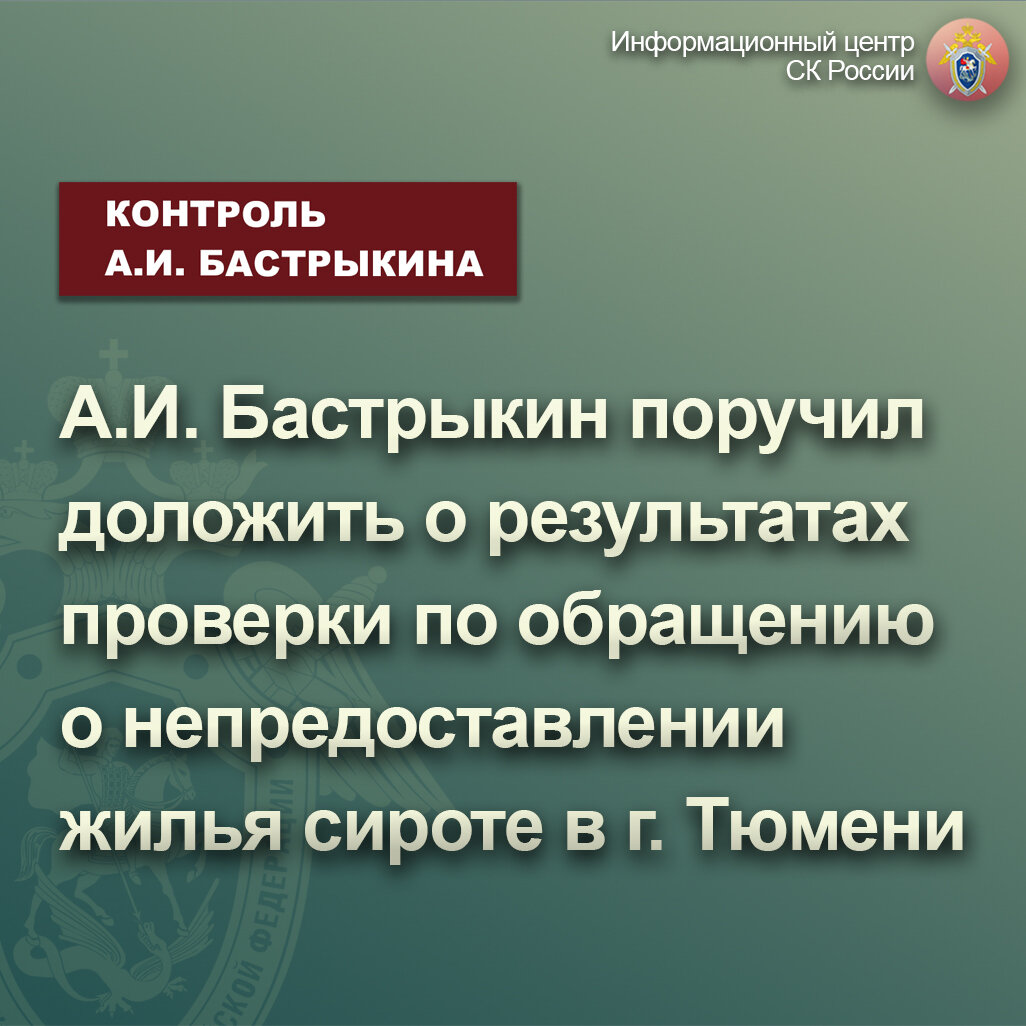 Председатель Следственного комитета Российской Федерации Александр Иванович Бастрыкин поставил процессуальную проверку на контроль в центральном аппарате ведомства и поручил руководителю СУ СК России по Тюменской области Александру Александровичу Кублякову доложить о ее предварительных и окончательных результатах, а также мерах к восстановлению жилищных прав сироты.