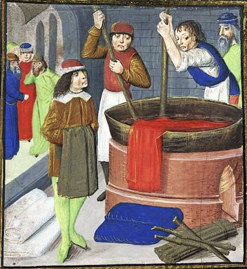 Сегодня подробнее расскажем о том, чем конкретно красилась одежда. Рекомендуем прочитать предыдущую статью: Пройдемся по основным цветам, однако понятно, что некоторые красители могли давать разные оттенки. КРАСНЫЙ Самый известный - пурпур. Добываемый из моллюсков краситель может быть разным: огненно-красным, красным, багряным, фиолетовым. Этот краситель был очень дорогой, его могли себе позволить лишь богатые дворяне или королевская чета. И немудрено, для добычи одного кг красителя нужно переработать 10 тысяч моллюсков, которые живут в Средиземном море или в Атлантическом океане. Кермес - получается из насекомых под названием дубовый червец, краситель добывался на юге Европы, Турции, Кавказе. Дает ярко-красный, алый, малиновый, розовый цвета. Был доступен зажиточным горожанам. Схожим по свойствам был краситель кошениль, но он добывался уже с 16 века, в Мексике и Чили. Для людей среднего класса была марена - травянистое лекарственное растение, дававшее красный, кирпичный, охряной, мал