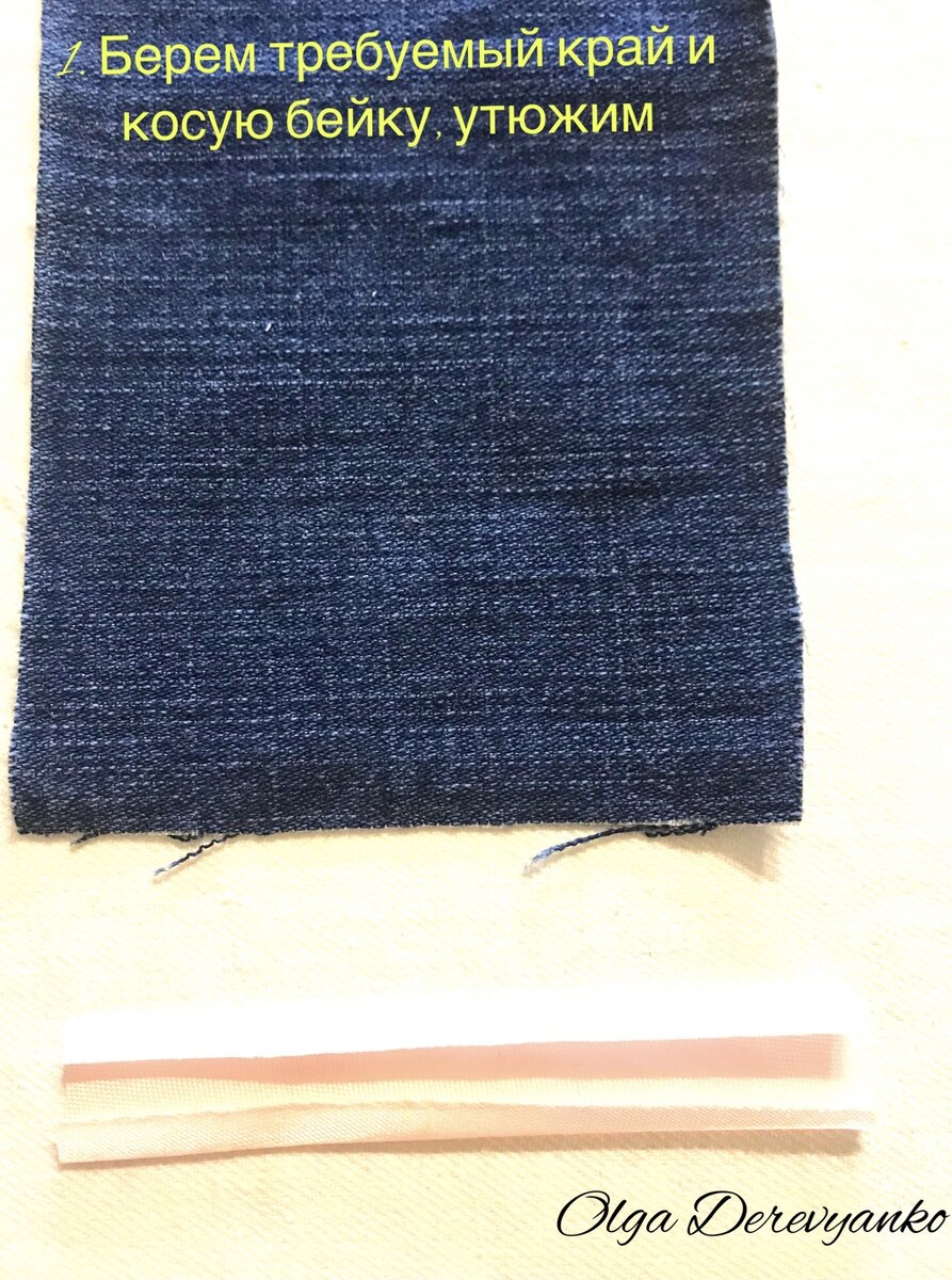 Мастера с опытом зачастую одним швом притачивают косую бейку к срезу, но для этого надо быть уверенным пользователем машинки и иметь достаточный опыт. Начинающему мастеру можно подстраховаться и наметать /п.3 и п.7/. После прокладывания строчки намёточные стежки удалить. Если срез выполнен не по косой, то косую бейку можно заменить любой лентой, подходящей ширины, заутюжить, как косую бейку и обработать ей. Или выкроить из имеющейся под рукой ткани аналогичную ленту. Это только при условии, что край по прямой!!! Обработать косой бейкой срез пояса можно сразу после его дублирования.