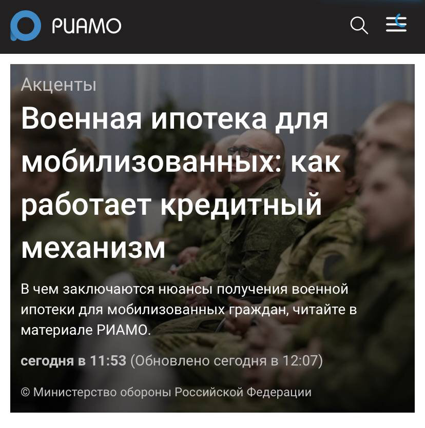Подготовили по просьбе Регионального информационного агентства Московской области (РИАМО) статью о военной ипотеке для мобилизованных. Переходите по ссылке, чтобы полностью разобраться в данной теме О НАС: