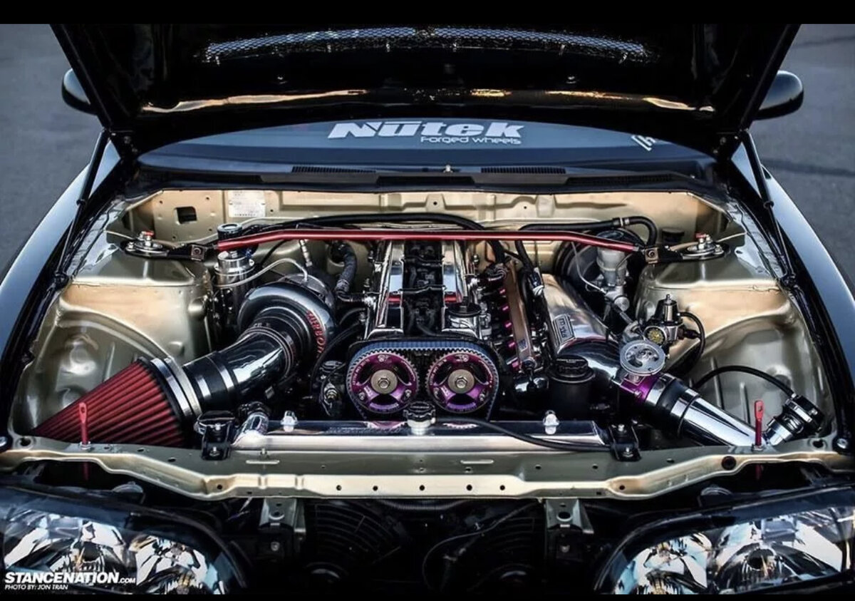 Двигатель 2JZ-GTE уже неоднократно доказал, что он способен выжимать более 2000 л.с. Для этого потребуется турбина более 64мм, однако, это не так сложно, как может показаться. Начните с турбины 72мм и подумайте об установке кованых поршней и шатунов, а также более прочных крышек коренного подшипника. Более широкие шпильки головки не позволят головке цилиндра отрываться от блока. Кроме того, советуем обратить внимание на инжекторы 2000сс и пару-тройку топливных насосов. Впрочем, всё зависит от безбашенности вашей идеи.
