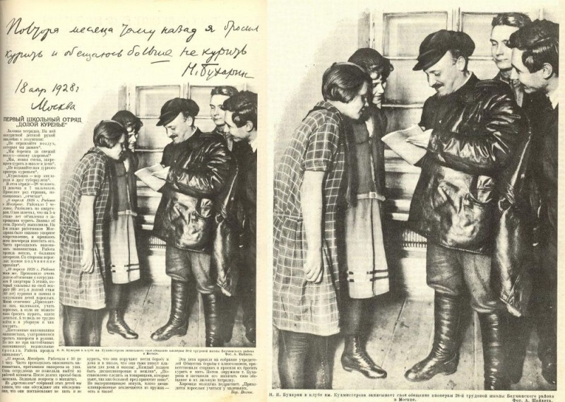 Николай Иванович написал в тетрадку школьников: "Полтора месяца тому назад я бросил курить и обещаюсь больше не курить. Н. Бухарин. 18 апр. 1928 г. Москва".