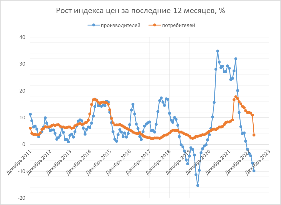 Вчера вышли данные Росстата по этому показателю, так что продолжу своё ежемесячное сравнение, а то мало кто этот показатель мониторит. За скользящий год по нему и ИПЦ (индекс потребительских цен) картина такая. Всё сильно снизилось, т.к. из скользящего года вышел март 2022-го с его аномальным ростом. Но если мы посмотрим на накопленную инфляцию, то увидим следующее. Потребительские цены после отката летом-осенью 2022 перешли к обычному росту. А с ценами производителей те же тенденции, только более выраженные: и спад был сильнее, и рост теперь немного сильнее. В разрезе товаров он выглядит так. Растут цены по добывающей отрасли - возможно, ослабление рубля сказывается. Впрочем, за год цены по ней всё равно сильно упали (процентов на 30-40), так что сейчас, можно сказать, восстановительный рост (те же тенденции по нефтепереработке). Из обработки в минусе цены на бумагу - возможно, всё ещё сказываются санкции на экспорт в Европу продукции деревообработки.