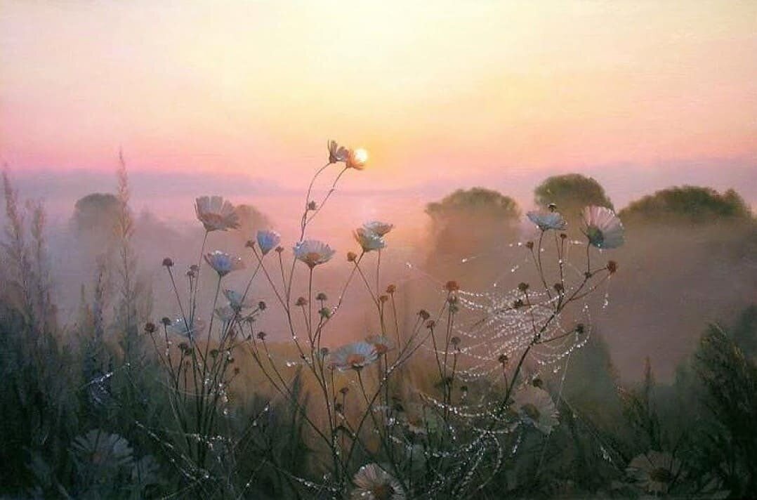 Ночь осыпалась пеплом на ранней заре. Погасил странник яркие звезды. И в рассветных осколках , таясь в тишине, Серебром горят белые росы. Будто нежатся сладко у солнца в лучах, Отдаваясь ему без остатка. И мерцают они в разноцветных мечтах, Исчезая в невидимой схватке. И всё дальше уносит сгоревшую ночь, Ветер-странник гуляя по свету. Только всё повторится конечно точь-в-точь, Завтра с новым рожденьем рассвета. 20.04.2023 Елена Синдякова (Иллюстрация и-нет)