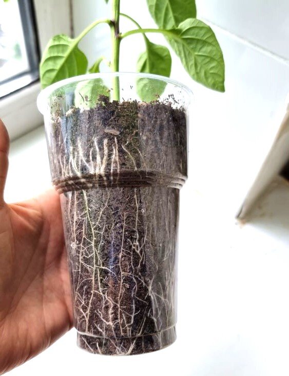 Здравствуйте дорогие огородники! Приближается время для высадки рассады овощей – томатов, перцев, баклажанов и мы по несколько раз в день изучаем прогноз погоды в надежде на чудо, но погода диктует свои правила. Если высадка рассады задерживается, то растения начинают стареть. В этой статье на примере рассады перцев и баклажанов я покажу признаки старения рассады. Также вы можете просмотреть видео, где я спасаю свою рассаду перцев и баклажанов от старения, ссылка тут. 1. Корни освоили весь ком земли в рассадных стаканах. Когда корням уже нет места для роста, то из-за тесноты они могут начать отмирать и, конечно, они уже вычерпали всё питание из небольшого объёма грунта. Подкормки тут мало чем помогут, нужно дать растению новый объём земли для роста корней и перевалить рассаду в горшки побольше. 2. Нижние листья у рассады начали желтеть и отмирать, это может происходить из-за нехватки освещения, когда рассада стоит плотно. Выход – расставить рассаду реже, тем самым улучшить освещение. 3