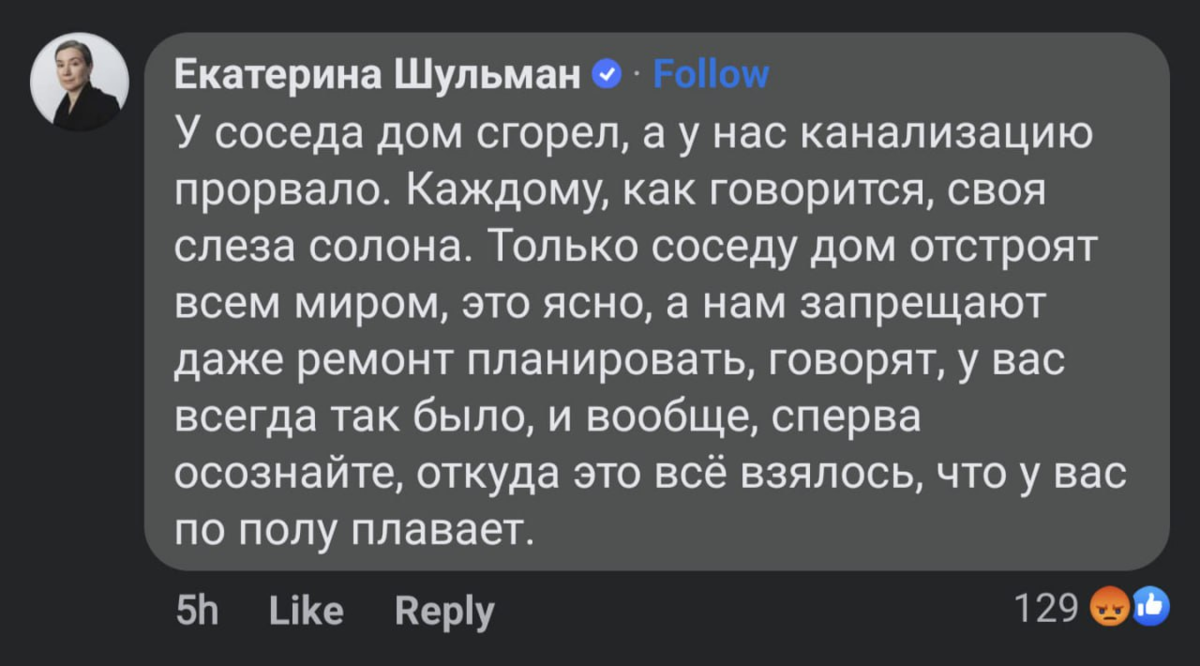 Бедная Катюшка...Надо же, какие неприятности у нее! А что, там, где она теперь живет, аварийную службу нельзя вызвать? Нет? Ну, тогда пусть терпит. Или бегает, как сосед, с просьбой вычерпать приплывшее к ней всем миром. Не самой же этим заниматься, правильно? А может, у нее действительно "всегда так было", как и у Юли Латыниной, просто мы не обращали внимания. Ибо подобное всегда тянется к подобному! Или, как говорится, "кесарю - кесарево!" Чего жаловаться-то? Вариант "осознать, откуда у нее все это взялось" - он в целом неплохой. Осознание - это всегда прекрасно. Если ты осознал, в чем первопричина прорыва твоей канализации - это первый шаг к устранению течи. И все бы ничего, пусть развлекаются, но я никак не могу понять, почему эти люди с протекающими бесконечно чердаком и канализацией постоянно употребляют местоимение "мы". Мы, нам, у нас.... Мы ту вообще при чем? Лично я к Шульман никакого отношения не имею и иметь не желаю. Течи я не устраняю, жаловаться мне бесполезно - у мен
