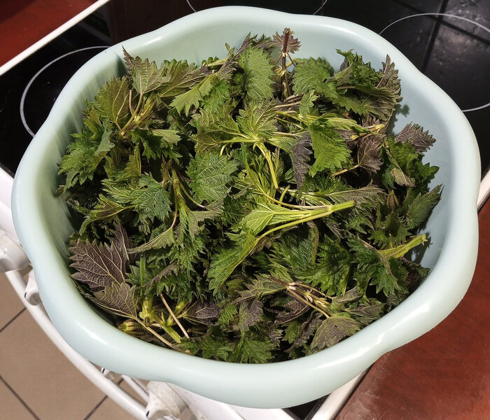 О чрезвычайной пользе употребления в пищу молодой крапивы не знает только ленивый. К сожалению, сезон сбора этого «весеннего овоща» очень недолог, поэтому хочется успеть порадовать себя и близких разнообразием блюд. Кстати, промытая и ошпаренная крапива прекрасно хранится в холодильнике несколько дней — это на тот случай, если приготовить весь объём сразу нет сил и возможностей. Из крапивы можно приготовить много вкусных блюд, но я начну с супов, как наиболее простых и популярных. Весна — начало сезона лёгких супов; пора говорить «нет» наваристым жирным бульонам из мяса, организм требует зелени и витаминов. Суп-пюре из крапивы с картофелем. Ингредиенты: — крапива: 250-270 г; * — куриный бульон: 800-900 г; — лук репчатый: 200 г / 1 крупная луковица; — картофель: 300 г / 2 шт.; — сметана: 100 г; — яичный желток: 2 шт. — яйцо варёное (вкрутую): 2 шт. — растительное масло (для обжарки): ~20 г; — соль: чайная ложка. * вес крапивы дан после обработки кипятком. Картофель нарезаем кубиками и о