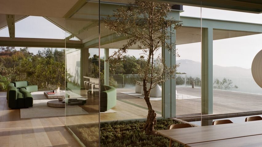 Колумбийская архитектурная студия Cinco Sólidos отреставрировала шатровый дом в горах за пределами Медельина для музыканта Хосе Бальвина, чтобы он выглядел как "дом в воздухе". Студия использовала следы предыдущей постройки при проектировании Casa Aire, который был задуман таким образом, чтобы дом казался отдельным от крутого участка. "Что касается концептуального развития, дом вращается вокруг идеи выражения легкости и плавучести как принципов", - говорит студия. "Дизайн обеспечивает восприятие внутренней и внешней частей как отдельных от земли, на которой он стоит, как будто это дом в воздухе". С жилой площадью 1 593 квадратных метров, дом был построен параллельно склону, имеет ряд комнат, которые соединяются с навесными бассейнами. Дом обшит бетонными панелями с стальными акцентами, покрашенными в светло-зеленый цвет, и состоит из ряда шатровых объемов с большими панорамными окнами. Cinco Sólidos взяли на вооружение японскую архитектуру и включили ряд отражающих бассейнов и внутренн