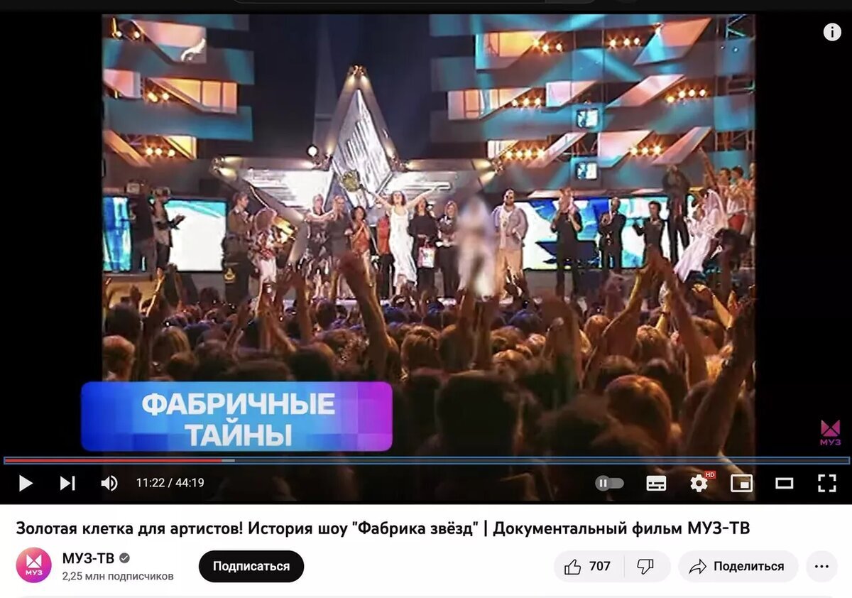 Канал «Муз-ТВ» замазал певицу в документальной картине. Осудившую специальную военную операцию певицу Елену Темникову убрали из документального фильма про «Фабрику звезд ». Телеканал «Муз-ТВ» замазал артистку в кадрах общего плана. На видео, размещенном на YouTube, певица стоит на сцене в белом платье, однако ее фигура почему-то размыта. Этим немедленно возмутились фанаты. «Только я заметил, что когда показывали финал «Фабрики-2», там Темникова почему-то замазана?», «А можно поинтересоваться у «Муз-ТВ», по какой такой причине все, что связано с финалисткой Еленой Темниковой вырезано и заблюрено?», «Где Темникова?», «Вырезали Лену Темникову!» – написали комментаторы. Представители телеканала не стали никак комментировать такое решение. Елена Темникова о своем отсутствии в фильме также промолчала. Ранее Readovka писала о том, что какой факт скрывает от публики семья Анастасии Заворотнюк.