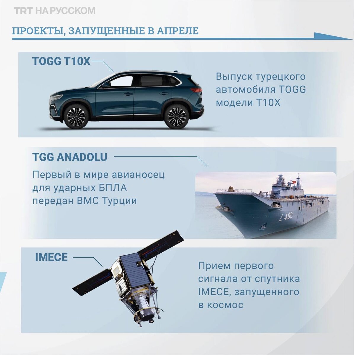 В Турции в апреле запустили целый ряд масштабных проектов Только за последние 15 дней в Турции запустили ряд крупнейших инфраструктурных, энергетических и промышленные проектов. Были введены в эксплуатацию TCG Anadolu, спутник наблюдения IMECE, началась поставка электромобиля Togg T10X, открылись городская больница в Коджаэли и несколько линий метро в Анкаре и Стамбуле.
