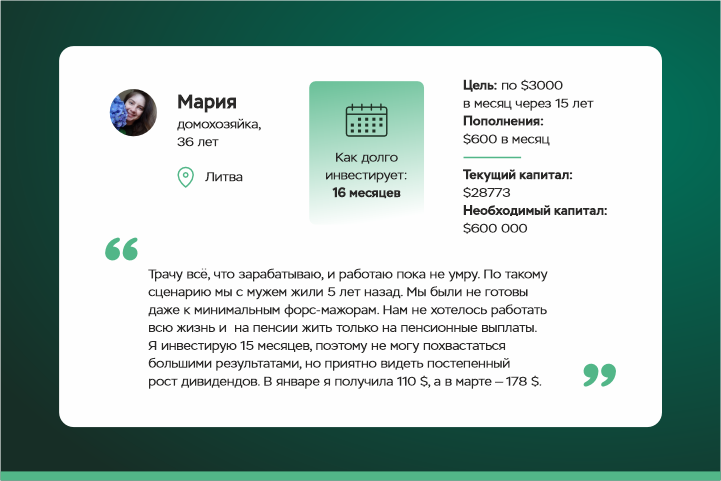 Иногда то, что я узнавала на курсе, ОЧЕНЬ СИЛЬНО ОТЛИЧАЛОСЬ от того, что я слышала до этого. Большим открытием стало знание, что системность и безоговорочное следование личному финансовому плану в сочетании с инвестиционным горизонтом 15 и более лет приведут нас к цели — 550 000 $. Звучало как план!"