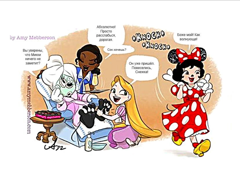 Автор забавных историй о Pocket Princesses - художница Эми Мебберсон. Её героини живут в одном общем доме, ведут совместный быт и постоянно попадают в переделки, из которых выходят используя юмор. В этот раз собрала для вас сборник из историй с участием маленького зелёного пришельца. Море обаяния и улыбок уже ждут вас. О других приключениях девочек читайте в прошлых выпусках (ссылка на все комиксы будет в конце статьи). Приятного чтения! Всё включено Принцессы решили устроить каникулы для знаменитой мышки Минни. А вместо неё с туристами пообщается Белоснежка. Рободевушка Она соединила в себе внешние черты и таланты всех девчат. В кибер-принцессе нет изъянов и она... совсем не понравилась остальным обитательницам дома. Аквариум с подогревом Хулиганка Ванилопа набедокурила. Ариэль из-за неё ужасно замёрзла. Резкое похолодание Среди принцесс есть очень теплолюбивые. В морозные зимние дни им тяжко приходится. Особенно, когда морозы наступили весной или летом, из-за дара Эльзы. Пятница трин
