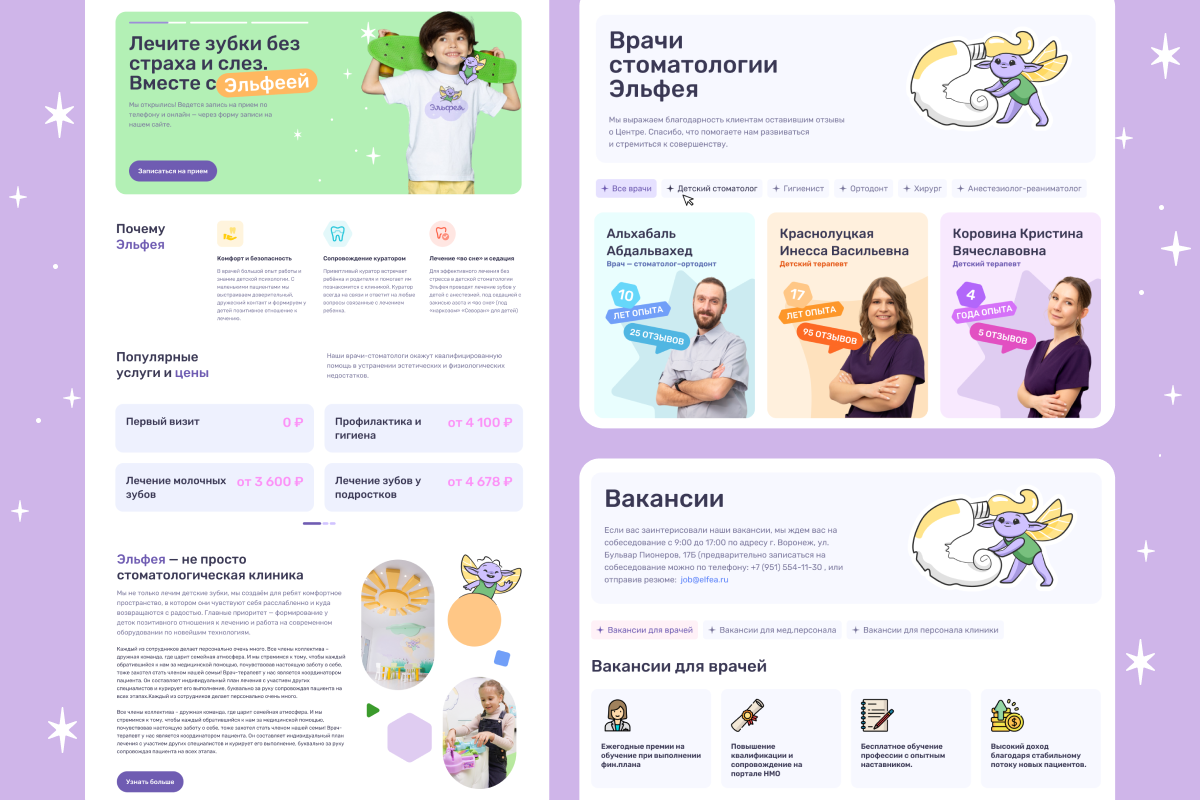 Разработали сайт «Эльфеи» на CMS 1С-Битрикс. Ресурс проектировали, как справочник с детальными описаниями и фото, и сложной вложенностью страниц. Такой сайт-«википедия» важен для родителей, — они месяцами читают блог клиники и советы специалистов, перед тем, как выбрать детскую стоматологию, особенно если это первый визит к доктору. Также большое количество страниц и блоков с контентом продвигает ресурс по SEO.