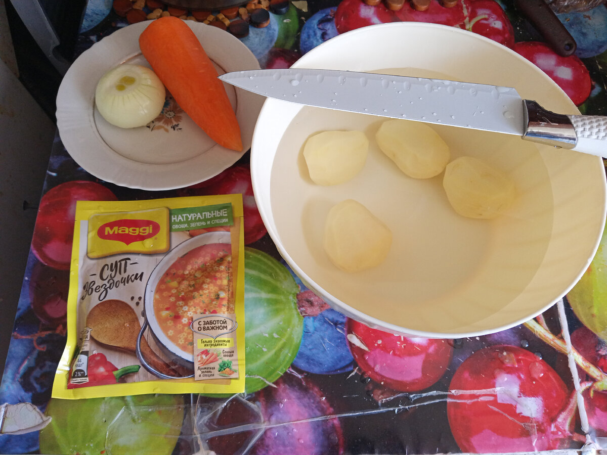 Для приготовления нам потребуется: картофель,морковь,лук,соль,смесь перцев,сухая петрушка,сухой лук и суп "Звёздочки". Нарезаем лук и картофель(кубиком) ножом и натираем морковь на мелкой тёрке. Ставим на плиту примерно 1 литор воды и на сковороду выкладываем лук и морковь,чтобы сделать поджарку. Когда поджарка готова и вода в кастрюле закипела добавляем картофель и поджарку. Необходимо дать воде покипеть 15 мин. После всыпаем содержимое покета и перемешиваем ложкой. Оставляем на медленном огне покипеть 10 мин. При необходимости добавить мясо(отваренное заранее). Добавляем всё,что на рисунке по вкусу. Приятного аппетита!!! Кому понравилось или было полезно ставьте ЛАЙК и ПОДПИСЫВАЙТЕСЬ на канал!!!С вами был ведущий канала "Мир на ладони", до новых встреч!!!!