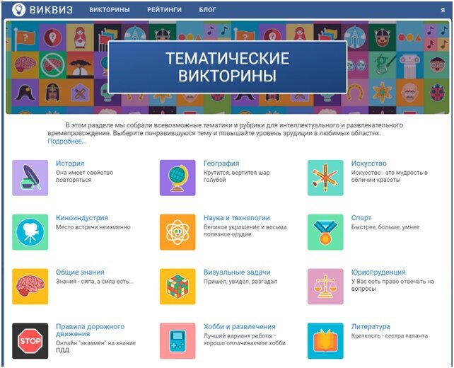 На сайте представлен широкий перечень видов викторин различных тематик. Выбирая определенный раздел, участники викторины могут повышать свой уровень – звезды и достижения начисляются за скорость и правильность решений. Увеличение уровня в разделе позволяет открыть новые пакеты заданий, что расширяет возможности получения новых знаний и более качественного закрепления имеющихся.