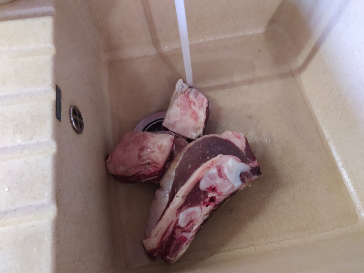 В это время занимаемся мясом - удаляем все несъедобное: кости, пленки, жир.