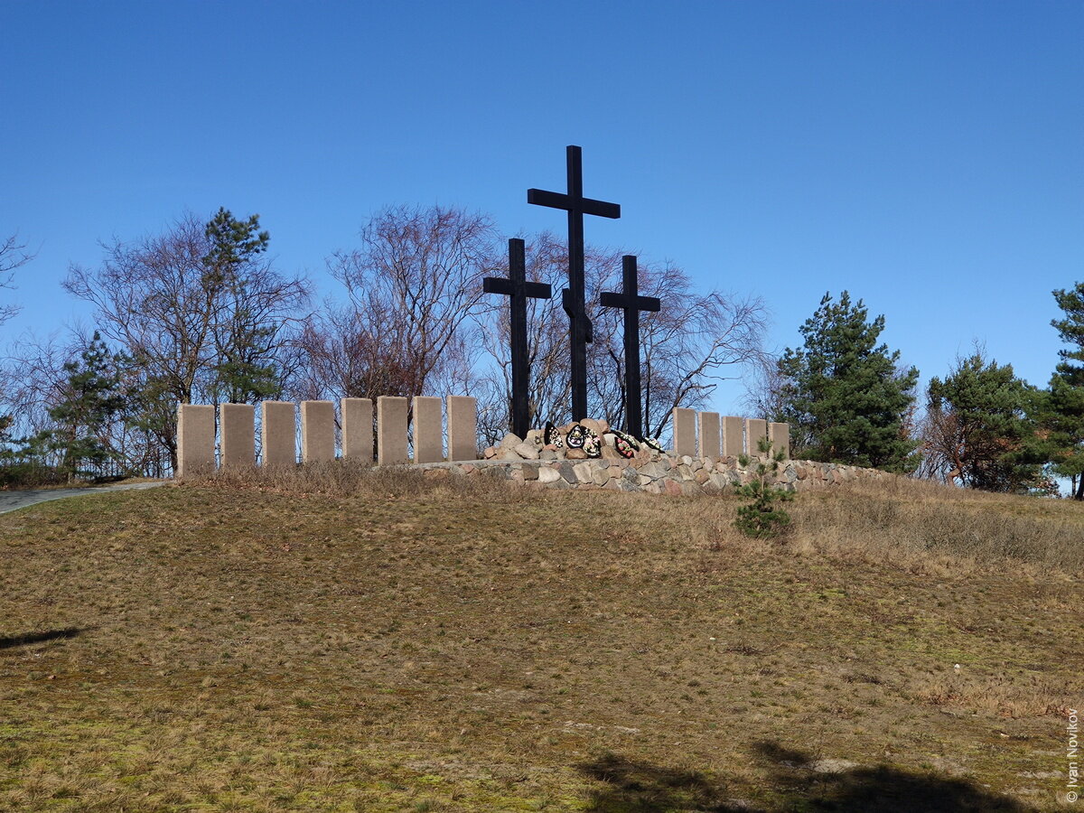 Балтийск- тихий город. Жизнь здесь размеренная, провинциальная. Многие приезжают сюда на отдых. Мы гуляем близ моря. Здесь густые ветки деревьев, из-за песчаных барханов совершенно безветренно, но шум Балтики слышен громко и отчетливо. Я хотел показать ребятам форт Восточный. Собственно, вот и он, его ворота: Форт принадлежит военным и пройти внутрь не получится. Среди высоких деревьев то и дело гуляют пушистые ухоженные собакены. С виду они нечейные. - Здравствуйте, мистер пес! По дороге идем выше. Справа виден ров форта Восточный: И вот слева видим каменную ограду и закрытые маленькие воротца. Можно спокойно зайти. Сперва даже кажется, что попал в какой-то прибрежный парк. Здесь красивая природа и застывшие в вечной борьбе с ветром сосны: Но наличие крестов заставляет вести себя тише и задуматься о вечности. Мы на интернациональном мемориальном кладбище: Интернациональное мемориальное кладбище в Балтийске – это воинское захоронение немецких солдат и офицеров времён Второй Мировой во