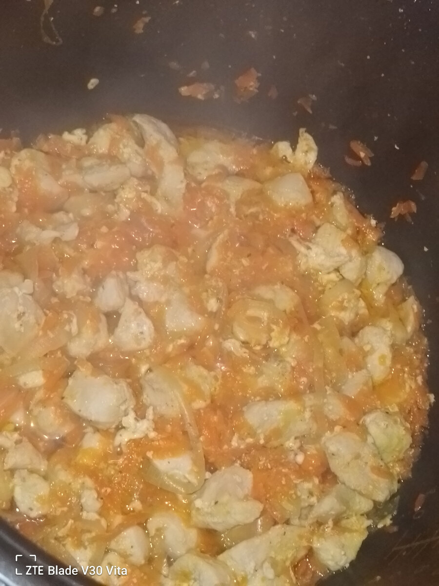 Курицу покупаем уже нарезанную кубиками. Там, вроде, 400 грамм. Поставила обжаривать с морковью и луком. Добавила чеснок. Сухие специи.