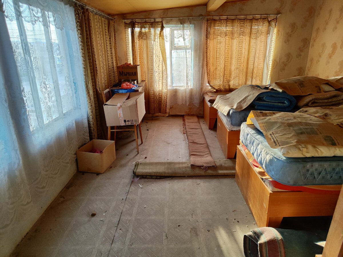 Как я и говорила, начинаю приводить в порядок старые комнаты эконом на сдачу. Первоначально делаю порядок для себя. Возможная сдача вторична и необязательна. Почитайте больше про мои планы ниже в статье : Действую согласно плану. Взялась пока за одну комнату. Это она на фото. Комната находится над кухней и такая же большая. Сначала выкинула хлам. Не так его много. Вещей в комнатах лишних почти нет. Было какое-то старое драное ватное одеяло в коробке. Сломанный вентилятор. Старые половики или ковры. Только длинный половик выглядит более менее. Его пока оставила. Может пригодятся какие-то куски, например, как половичок перед дверями. Скидывала вниз со второго этажа, чтобы не таскать. Всё старые занавески сняла. Большинство ещё целые, но не все. Что-то ушло в помойку. Белая тюль почти чёрная. Не знаю получится ли её отстирать. Кроме ее цвета, с ней все более менее. Шторы тоже ничего. Буду пытаться все выстирать. Не порадовало состояние одного окна. Рама прям рассохлась. Кажется, чт